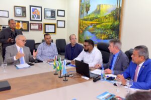 Durante a reunião, Denarium apresentou indicadores econômicos e estruturais de Roraima, destacando o crescimento do Estado, os avanços em infraestrutura e o papel estratégico da integração internacional para o futuro da região Norte.