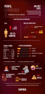 Dados analisados pela Corregedoria do Ministério Público do Estado de Roraima revelam o perfil das denúncias de violência doméstica registradas ao longo de 2025. O levantamento aponta que a maioria esmagadora dos denunciados é do sexo masculino, representando 96,5% dos casos, enquanto 3,5% são mulheres.